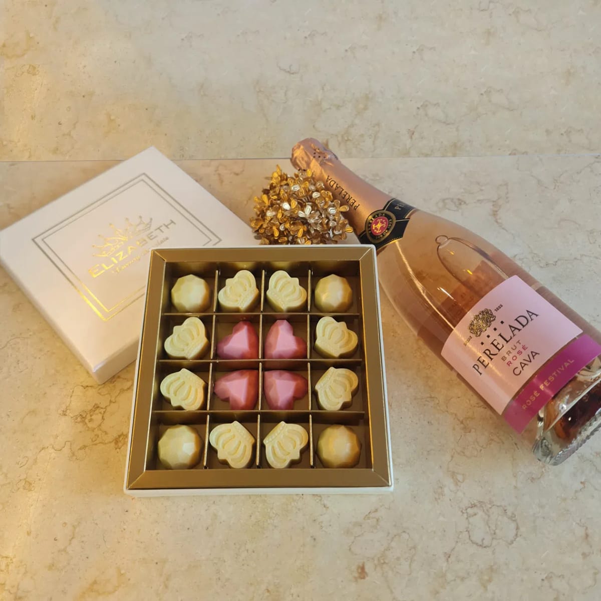 По хапка щастие всеки ден. Класика и елегантен стил с нашата “Allana” . Вкусове от бял белгийски шоколад с авторски белгийски мус, плътен ягодов шоколад, бял крем и сушени берита. Тази бонбониера е придружена от изтънчените нотки на испанската Cava розе “Perelada”